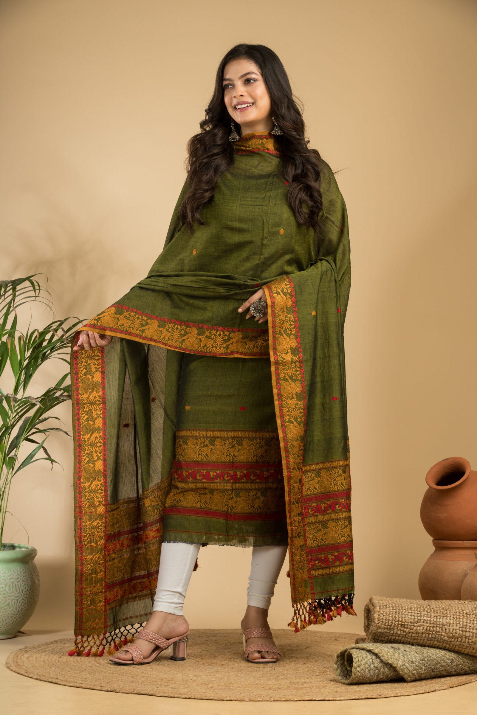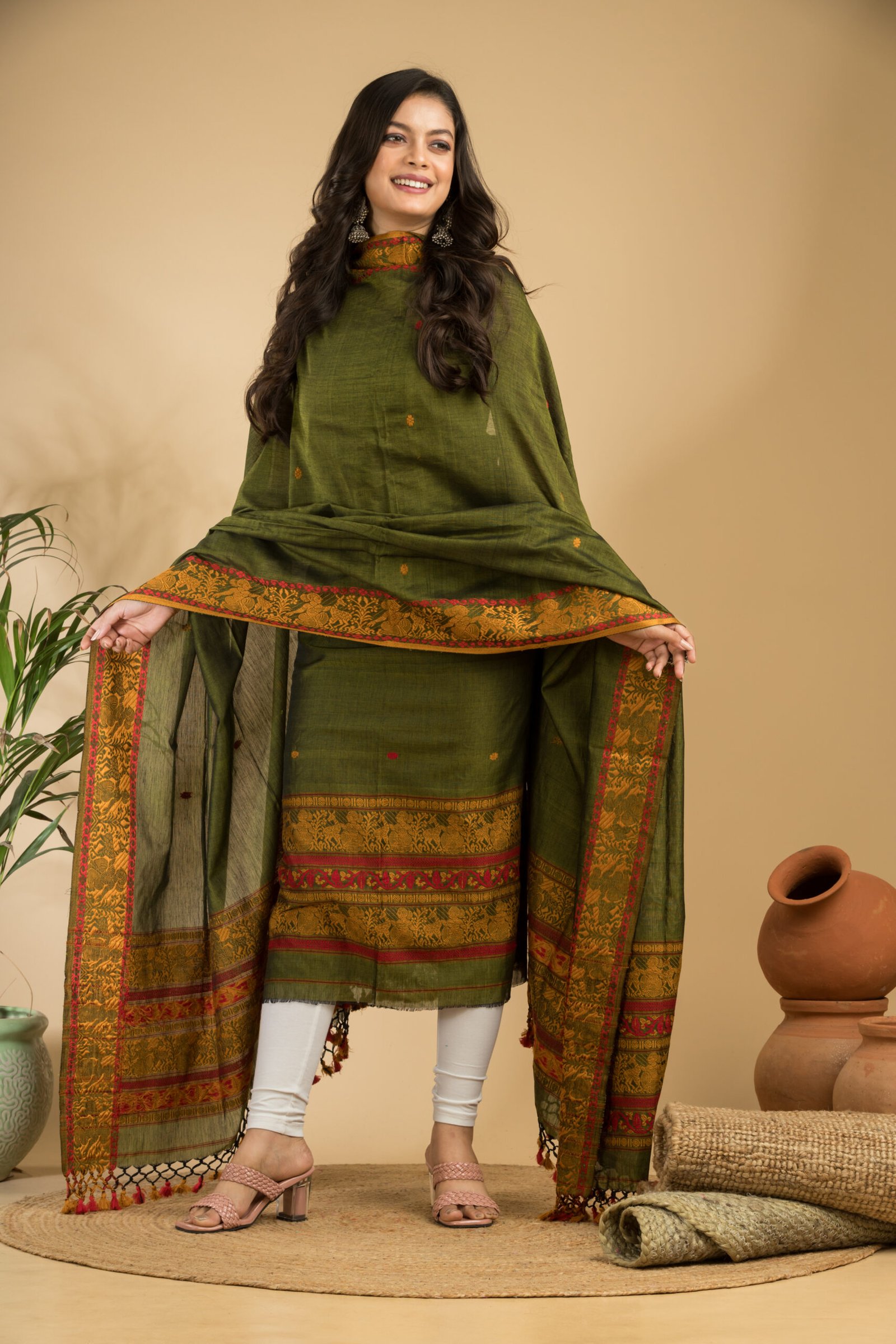 Featuring intricate Baluchuri motifs, this unstitched suit showcases the rich artistry of Bengal’s famed Jamdani weaving. The soft cotton fabric ensures wearability, while the unstitched design offers the freedom to tailor it to your personal style and fit. Whether for festive events or casual gatherings, it’s a versatile attire that stands out beautifully.