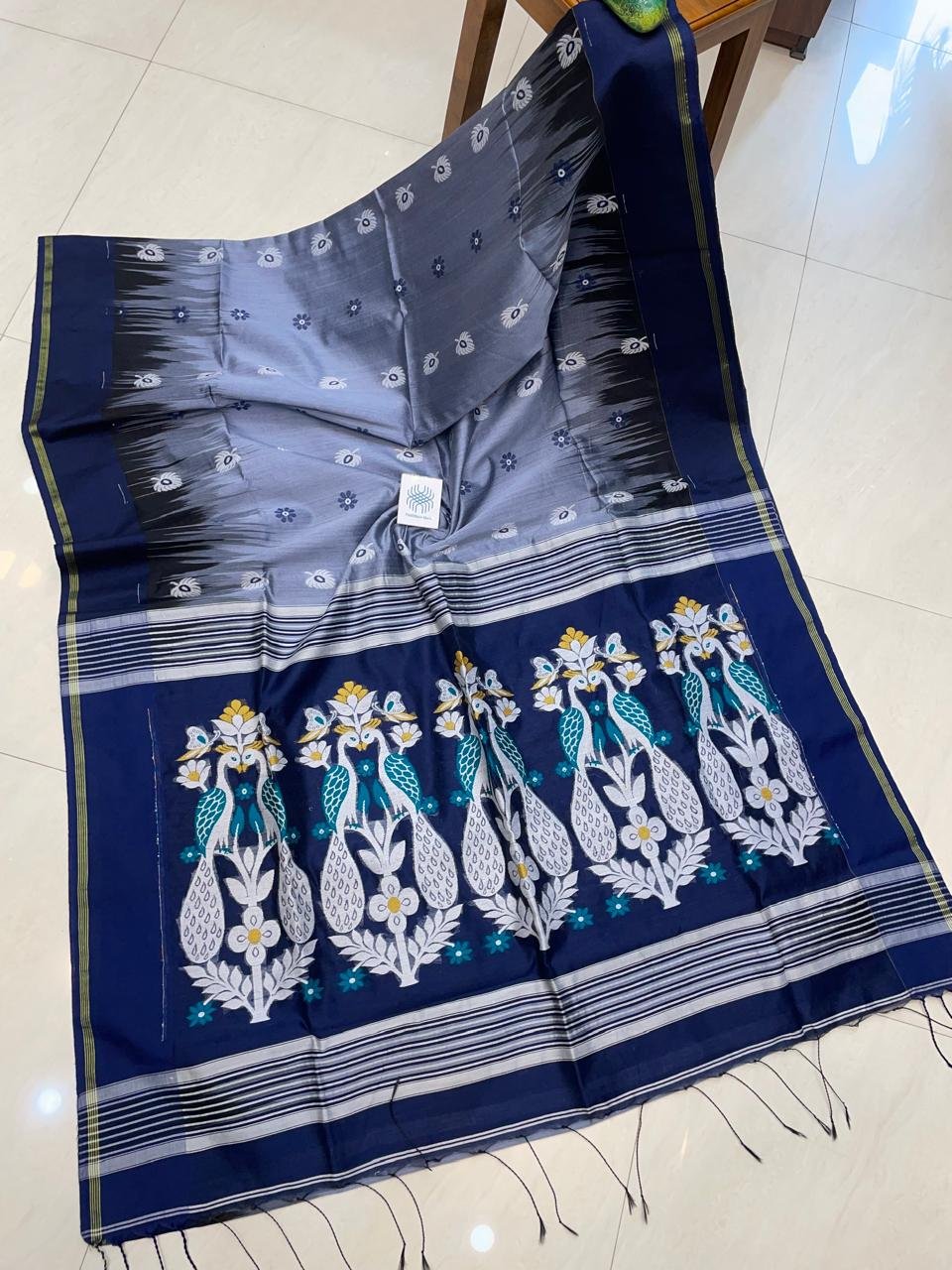 The highlight of this saree is the exquisite peacock embroidery intricately woven into the fabric. The fine details of the thread work add a touch of charm, making it a standout piece in your wardrobe.