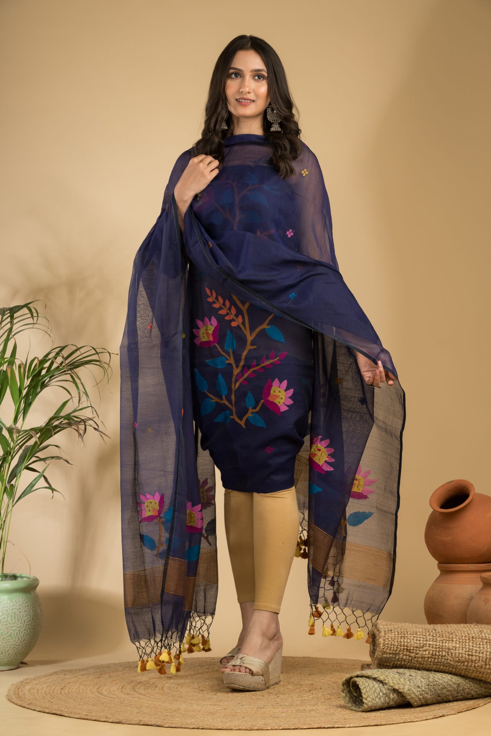 Made from the finest muslin fabric, this suit reflects intricate hand-woven Jamdani patterns, a hallmark of skilled craftsmanship. The unstitched design allows for custom tailoring, ensuring a perfect fit tailored to your unique preferences and style.