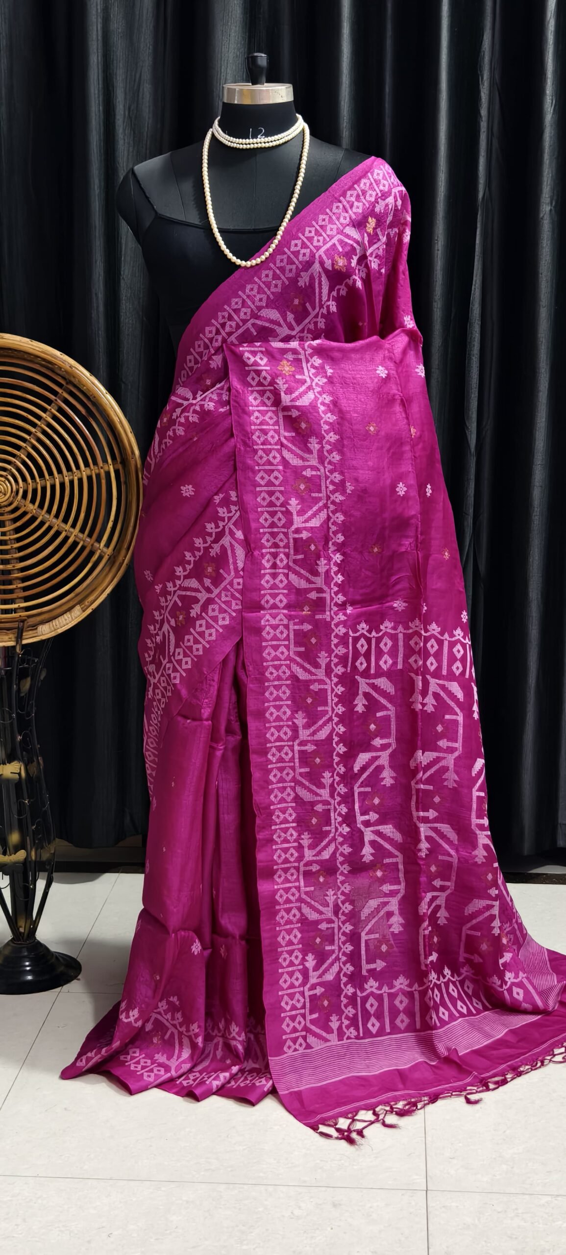 Experience the richness of genuine Gachi Tusar silk with this saree, which offers a lightweight, breathable texture. The intricate Jamdani weaving adds a touch of opulence, making this saree a masterpiece of elegance and style.