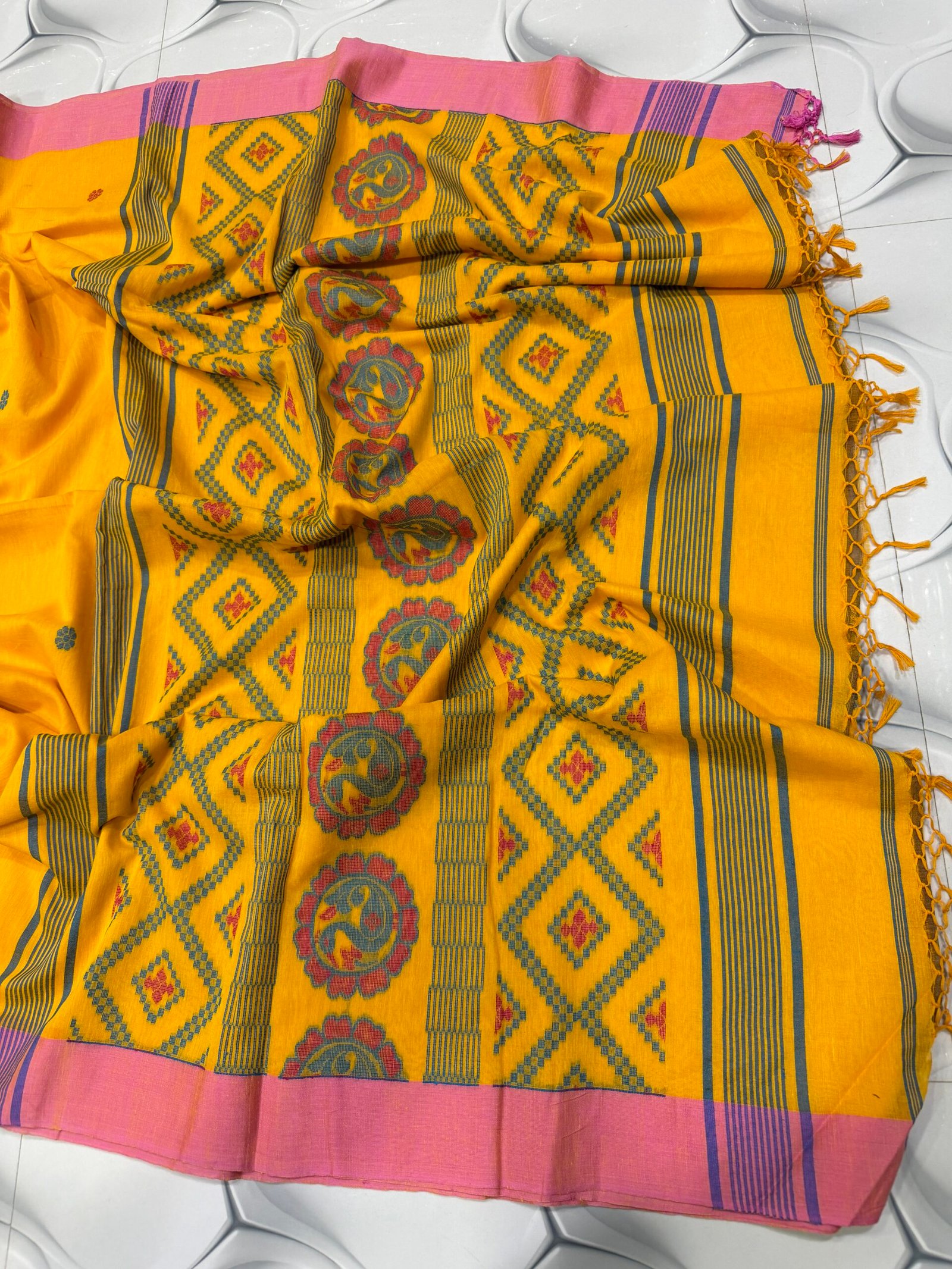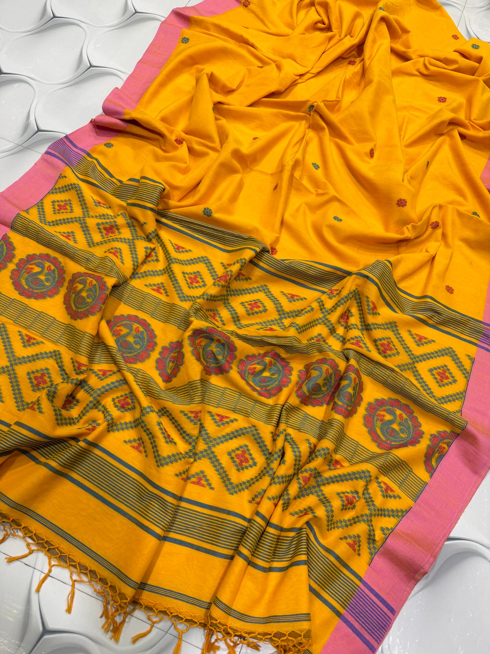 Crafted from 100% premium cotton, this saree ensures a lightweight, breathable feel, making it perfect for all-day wear. Its soft texture and seamless drape enhance your comfort, while the handwoven details guarantee unmatched quality and durability.