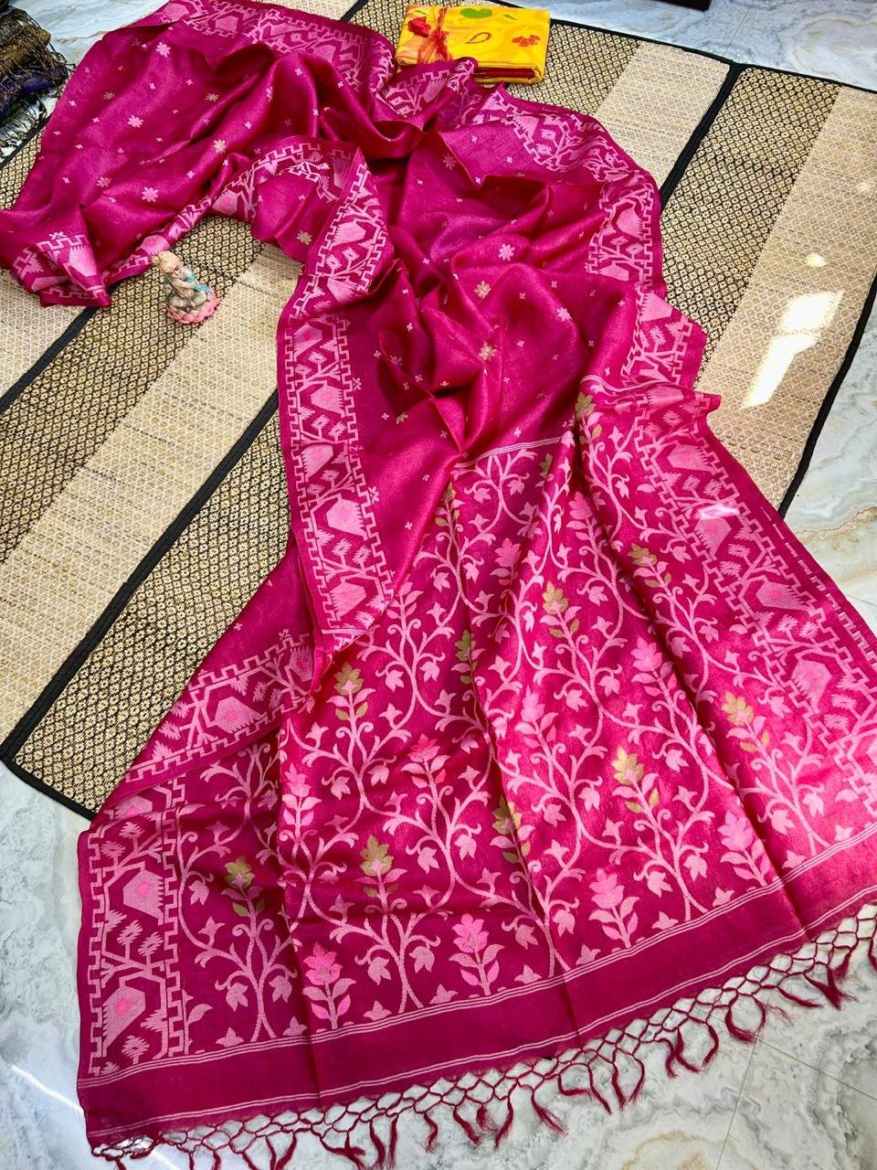 What sets this saree apart is its handwoven charm, ensuring you own a one-of-a-kind masterpiece. The natural sheen of Tassar silk adds a regal touch, making it a wardrobe treasure for years to come.