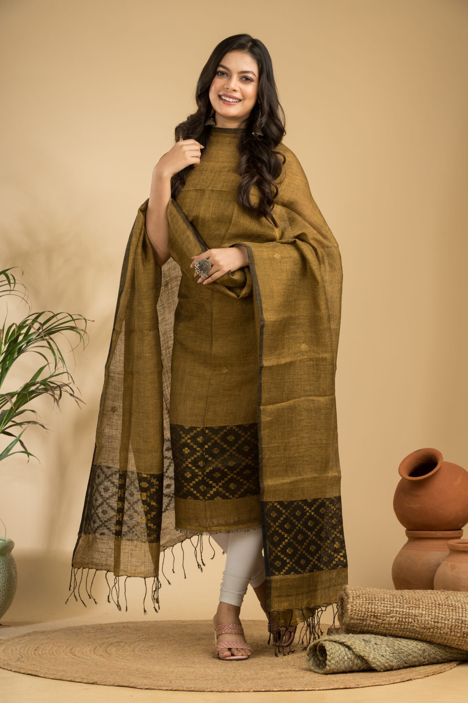 This Tissue Linen Unstitched Jamdani Suit – Elegant 2-Piece Set is crafted from premium quality linen fabric featuring delicate Jamdani weaving. The lightweight and breathable material ensures comfort while the traditional design adds timeless elegance to your ethnic wardrobe.